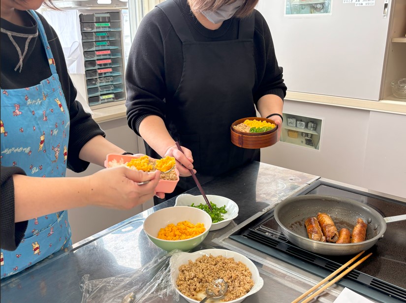 今年は、フードコーディネーターで北海道フードマイスターの舛田 悠紀子氏を講師にお招きし、毎日のお弁当や献立作りに活かせる料理を学びました。お弁当の定番「三食丼」を教わり、調理工程を少し変えるだけでいつもと全然違う仕上がりになることに参加者一同驚きました。また、彩り豊かで華やかなお弁当になるひと手間として、カラフルな野菜を使った肉巻きや、ラディッシュのピクルス、人参の飾り切りなど、保存も利いて、1つ加えることで“映えるお弁当”になる工夫を沢山教えていただきました。調理後は、実際にお弁当箱に詰めて完成させました。参加した皆さんからは、日頃のお弁当づくりでのお悩みや、お子さんの好き嫌いに関することなど質問も多く上がり、終始会話も盛り上がりを見せました。
