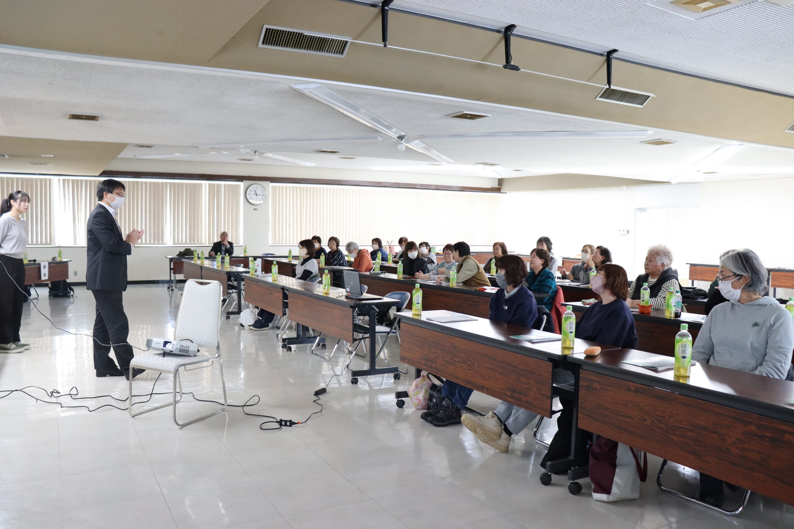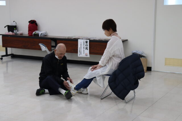 お昼休みには恒例の「作品展示・即売会」を行い、手作りのカゴバックやストラップなど昨年度より出品数も増え、大きな賑わいを見せました。昼食後は、石田スポーツ元職員の千葉 庸樹氏をお招きし、“正しい歩き方”についてお話をいただきました。靴ひもの結び方から歩く際の姿勢や目線、重心を置く所など、細かなポイントを沢山教わりました。中でも、膝に絆創膏を貼るだけで、つま先の向きが変わり正しい姿勢へ近づくことを知り、すぐに実践したくなりました。参加者からは「靴ひもの結び方で全然違う」「いつもこんなに姿勢が悪かったのか」など効果を実感した声が聞かれ、大変有意義な時間となりました。1時間半の講義時間では、まだまだ教わり足りないところでしたが、学んだことを持ち帰り、今後に活かしていきたいと思います。